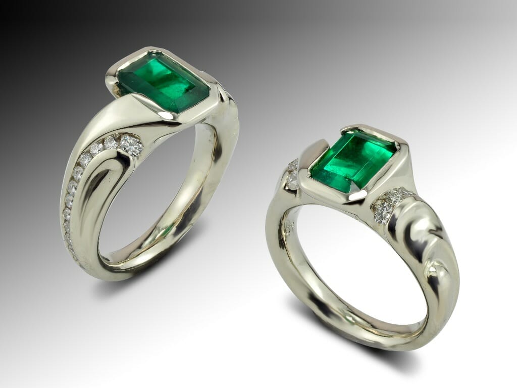 This 14k asymmetrical emerald and diamond ring was custom designed and hand crafted at our shop in Boston.