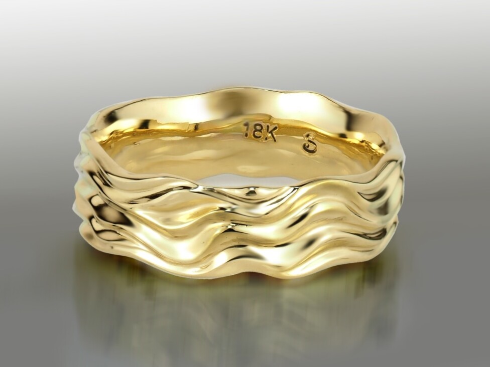 This 18k wavy carved band was custom designed and hand crafted at our shop in Boston. This ring is made of solid 18k yellow gold with a carved wave style design.