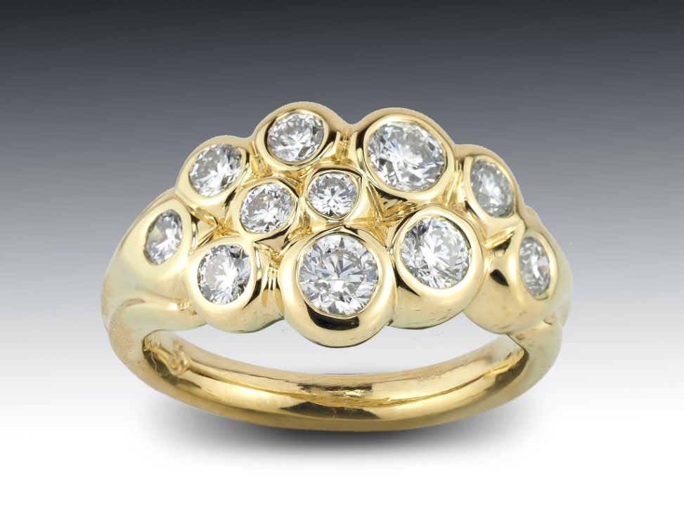 This 18ky diamond cluster bezel ring was custom designed and made at our studio in Boston. This style is a fun way to create something new from a collection of heirloom gemstones. Contact us to get started on your own custom jewelry design.