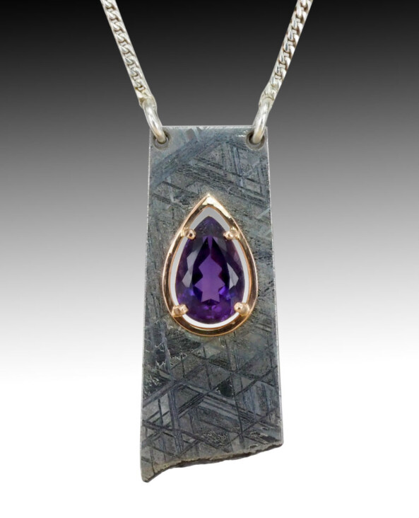 This custom designed meteorite pendant from Skylight Jewelers is one of a kind. The slice of meteorite is suspended from an attached chain and highlights an amethyst gemstones set in rose gold. The bottom edge of the meteorite is left raw and unpolished.