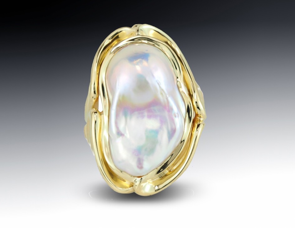 Our art nouveau white pearl ring was custom designed and hand crafted. This bespoke ring features a large white freshwater pearl set in an 18k yellow gold bezel with tendrils of gold wrapping around the shank.