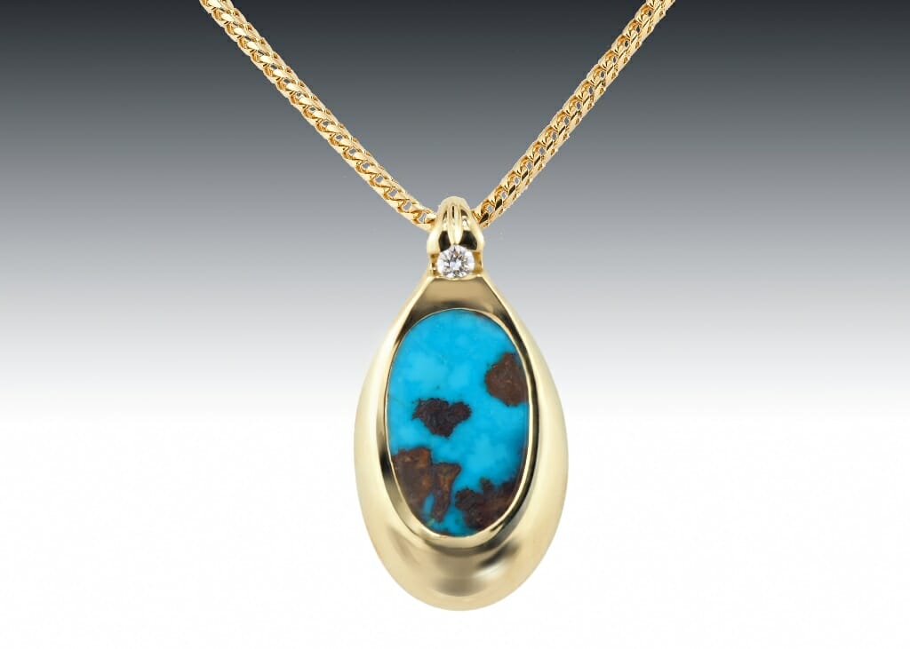 View Larger Image Dark Matrix Turquoise PendantCaitlin2022-06-01T16:47:14-04:00 Dark Matrix Turquoise PendantOval turquoise cabochon with dark matrix set in a custom designed 18k yellow gold pendant with a diamond. Share This Story, Choose Your Platform! FacebookXLinkedInTumblrPinterestEmail Related Projects