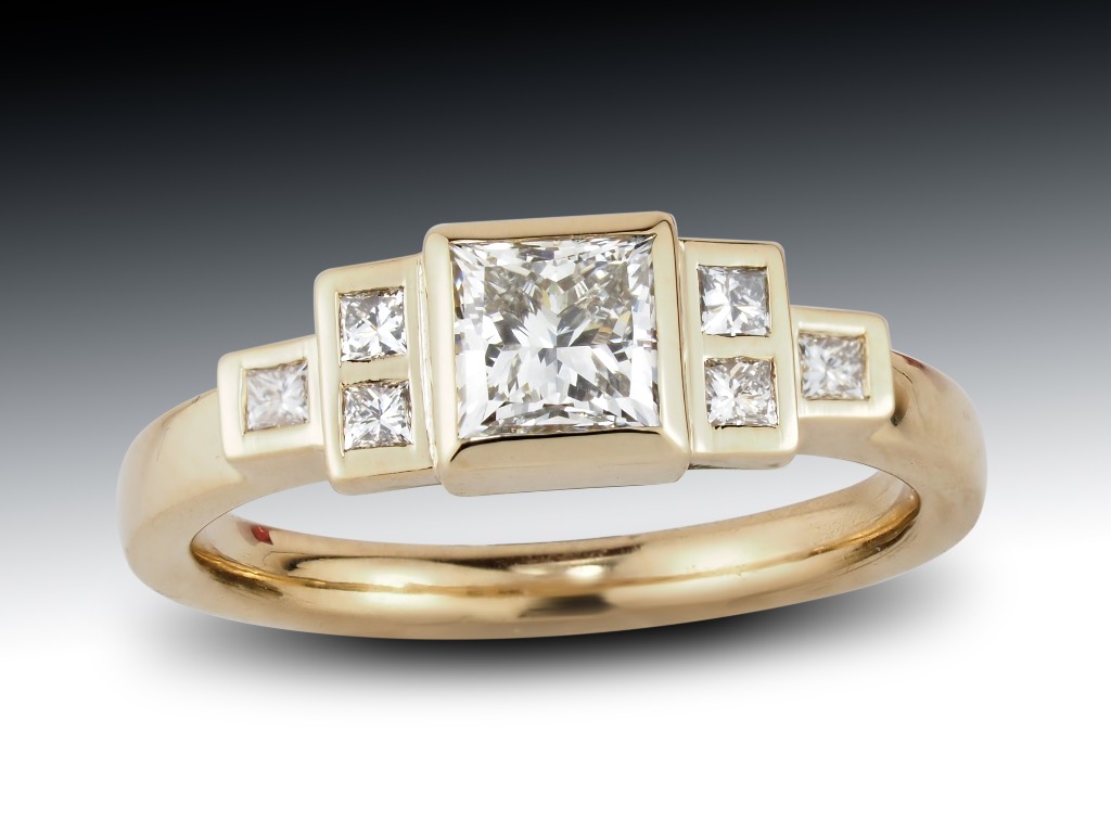 This elegant ring blends timeless sophistication with a modern geometric edge. Crafted in warm, polished yellow gold, it features a striking princess cut center diamond set in a smooth bezel that enhances both brilliance and durability. Flanking the centerpiece are smaller princess cut diamonds, carefully arranged in stepped settings that create a balanced, architectural look.
