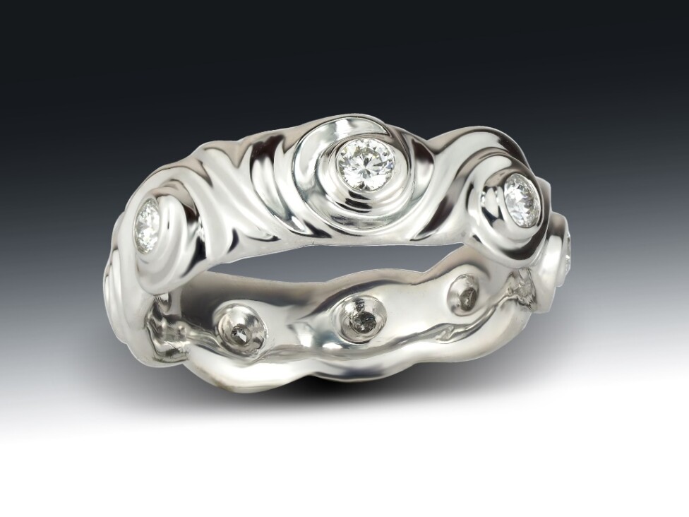 This diamond platinum swirl band was custom designed and handcrafted at our shop in Boston. This band is carved by hand and cast in solid platinum. It is bezel set with diamonds in a swirling pattern.
