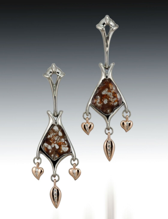 Custom designed long white gold settings for these unusual diamond slices, accented with rose gold dangles set with tiny diamonds. One of a kind earrings, designed and handmade at our shop in Boston.
