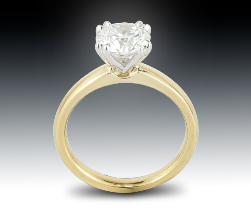 Our custom designed double prong two tone solitaire ring is handcrafted in yellow gold and platinum.