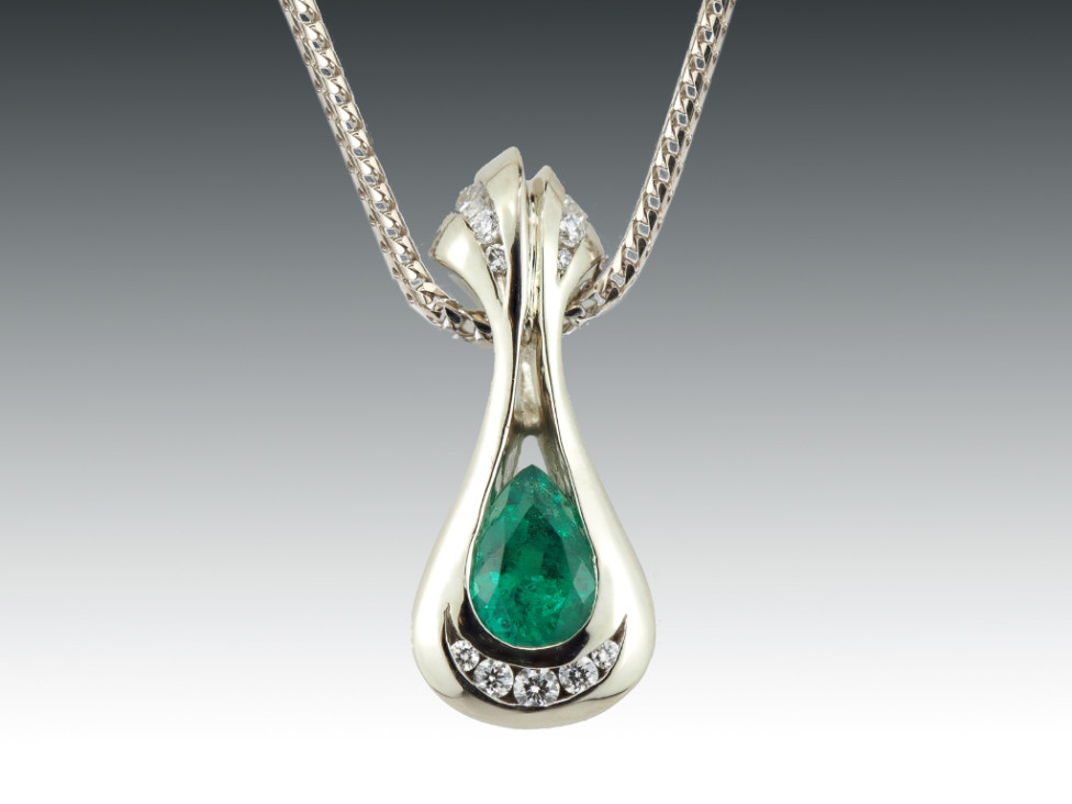 This custom designed emerald and diamond drop pendant was handcrafted at our studio in Boston. This piece is crafted in white gold and sculpted to complement the shape of the teardrop emerald gemstone. The pendant is finished with diamond accents to add extra sparkle to this stunning design.