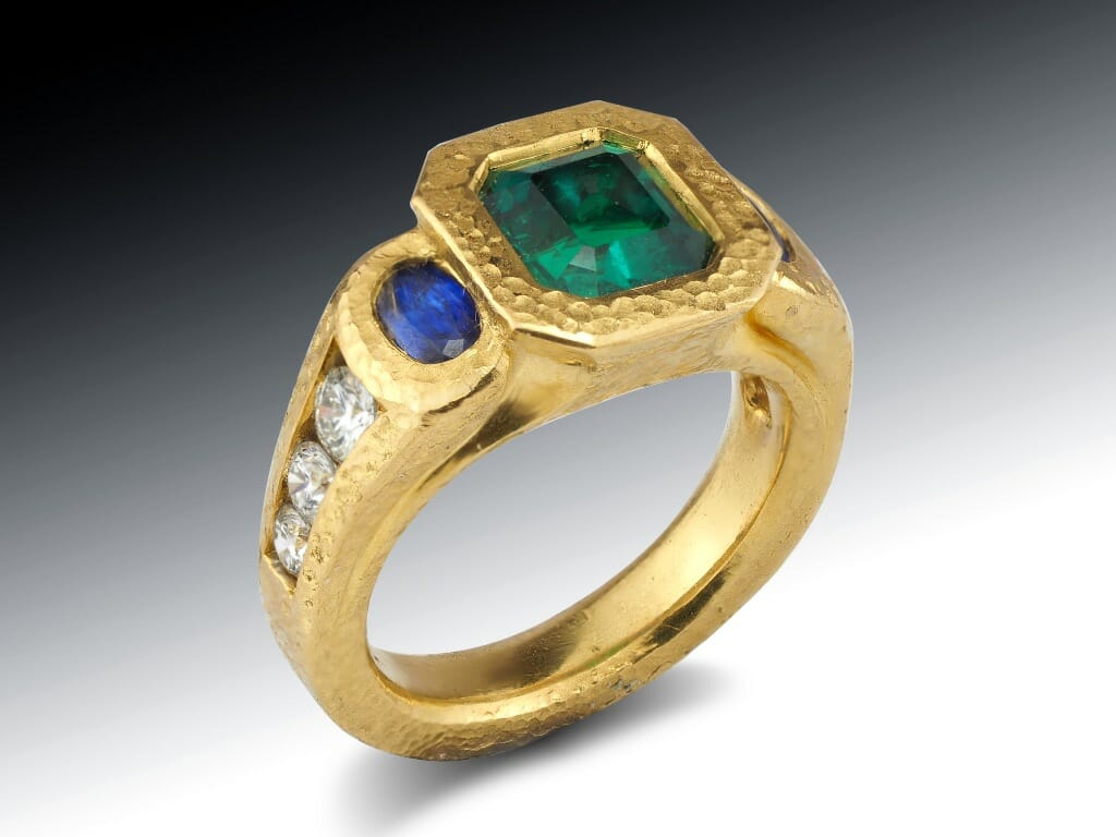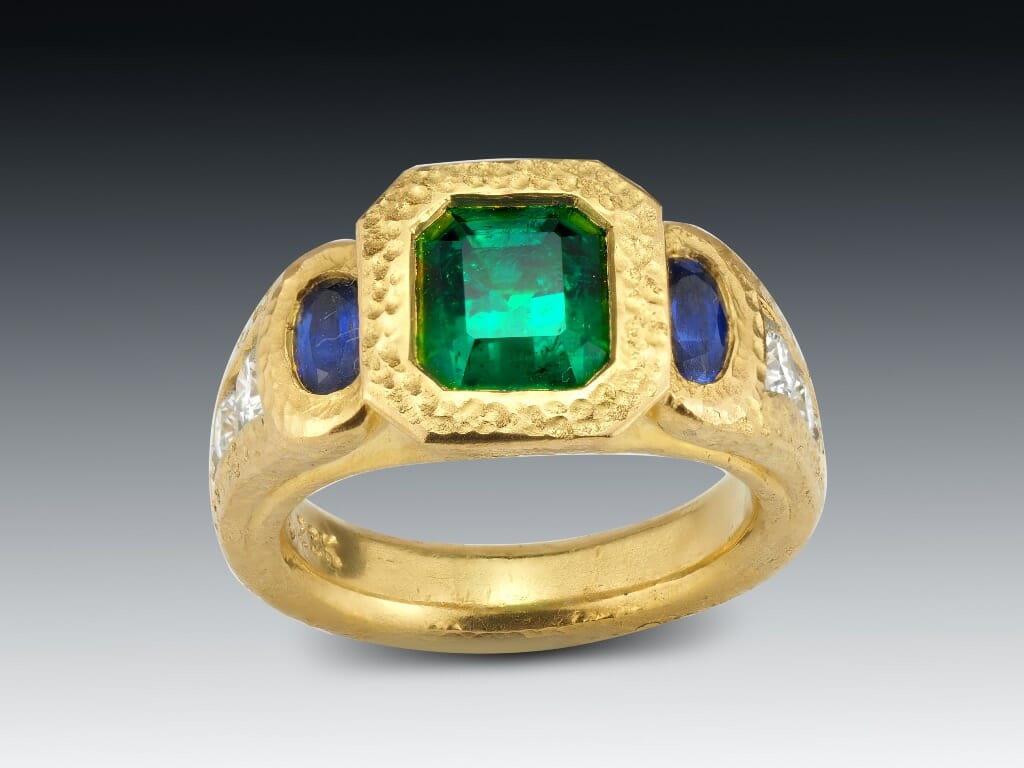 This emerald sapphire diamond 22k ring was a custom commissioned ring. This piece was uniquely designed and created by hand at our studio in Boston.  This ring is made of solid 22k yellow gold with a textured finish, set with a center emerald, two side sapphires, and accent diamonds running down the shank.