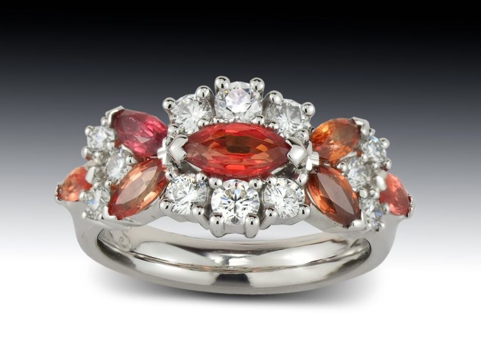 This fiery sapphire and diamond ring was custom designed and crafted at our studio in Boston. Learn more about our custom design process. Contact us to schedule a custom design consultation.