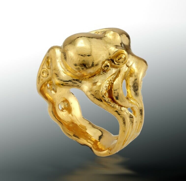 This gold octopus ring is custom designed piece from our studio in Boston. The hand carved sculptural octopus design is cast in solid 24k gold.