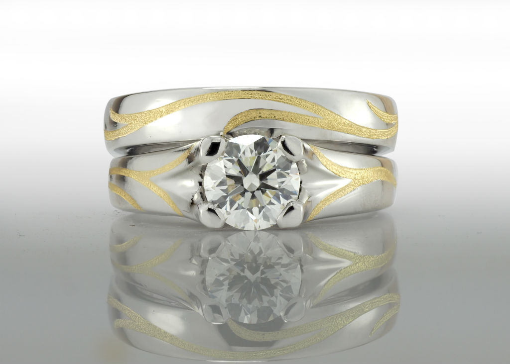 Custom designed diamond engagement ring and wedding bands in platinum inlaid with 24k gold. These rings are one of a kind and made by hand at our shop in Boston.