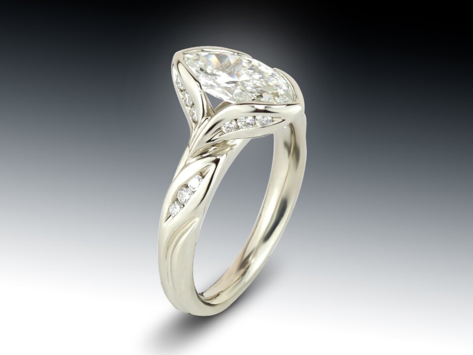 This leafy marquise diamond engagement ring is a custom designed piece, from our studio in Boston. This hand-sculpted setting is made in platinum, with a center marquise diamond and abstract leaf carvings set with small diamonds.