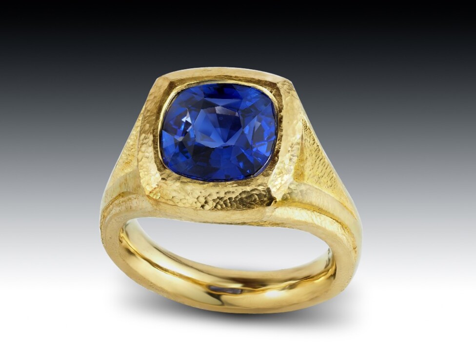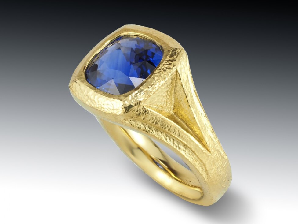 This mens cushion sapphire textured 18k ring was custom designed and handcrafted at our studio in Boston.