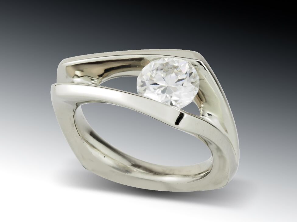 Modern elegance meets brilliant sparkle in this moissanite solitaire split ring. Crafted in 14k white gold, the design features a striking split-shank band that gracefully frames a round, brilliant-cut moissanite. The open setting enhances light flow, maximizing the stone’s fire and brilliance. A bold and contemporary choice for the modern wearer.