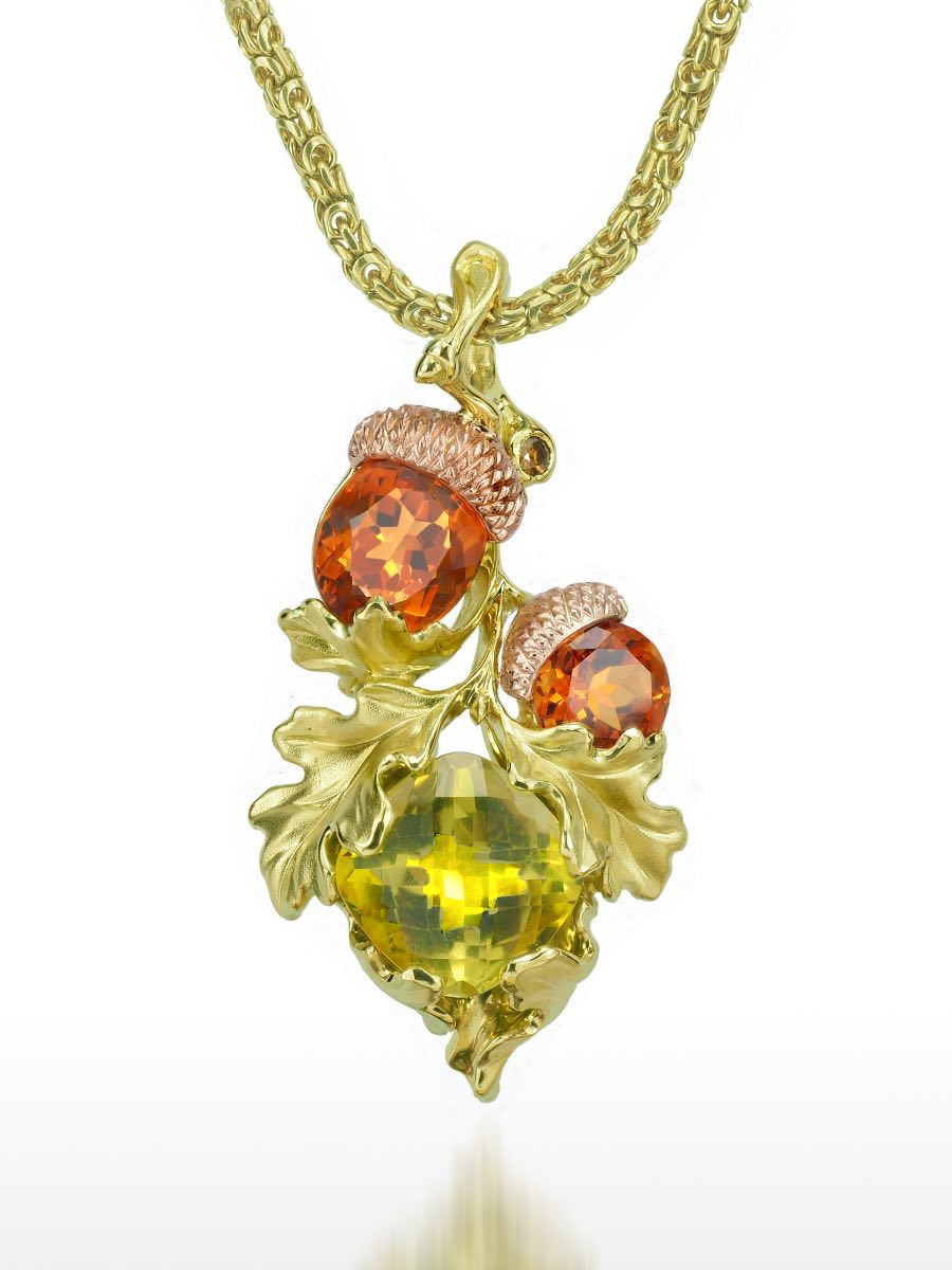 A one-of-a-kind celebration of nature and craftsmanship, this custom commissioned pendant captures the beauty of autumn in exquisite detail. Handcrafted in rich yellow gold, the design features delicately sculpted oak leaves embracing three vibrant, faceted gemstones. The organic flow of the metalwork gives the piece a lifelike elegance, as if the elements were gathered straight from a forest floor and preserved in precious form.