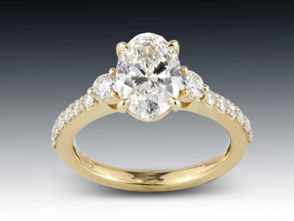 This custom designed oval diamond yellow gold engagement ring was crafted by hand at our shop in Boston. This ring features an oval center stone with round side stones and a pavé band. Contact us to get started on your custom designed engagement ring.