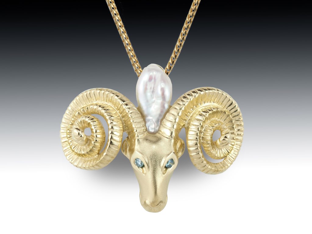 This pearl 18k ram pendant is a one-of-a-kind custom piece from our studio in Boston. This pendant was hand carved and cast in solid 18k yellow gold. It is set with a white freshwater pearl and blue irradiated diamonds. We love making unusual custom jewelry – contact us to get started on your custom design!