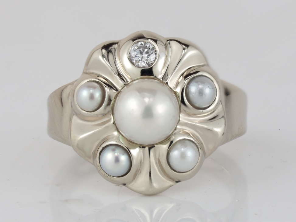 This unique pearl flower ring was custom designed and features white freshwater pearls and one diamond set in white gold.