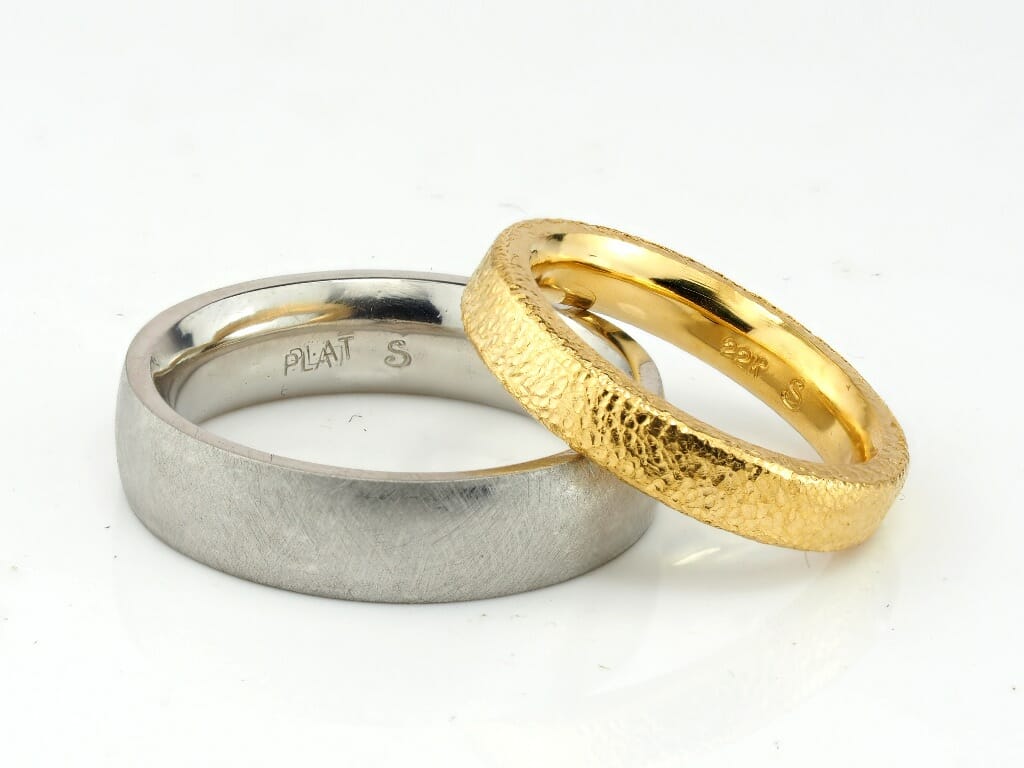 These platinum and 22K textured bands were custom designed and handmade at our shop in Boston. Learn more about our custom design process