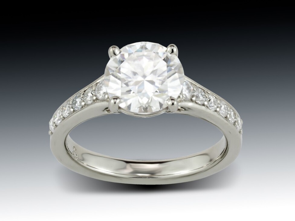This platinum diamond pavé engagement ring is a custom designed and handcrafted engagement ring. We take great pride in the craftsmanship and artistry of our individually crafted engagement rings. This ring is made of platinum with a four prong center stone and diamond pavé shank.