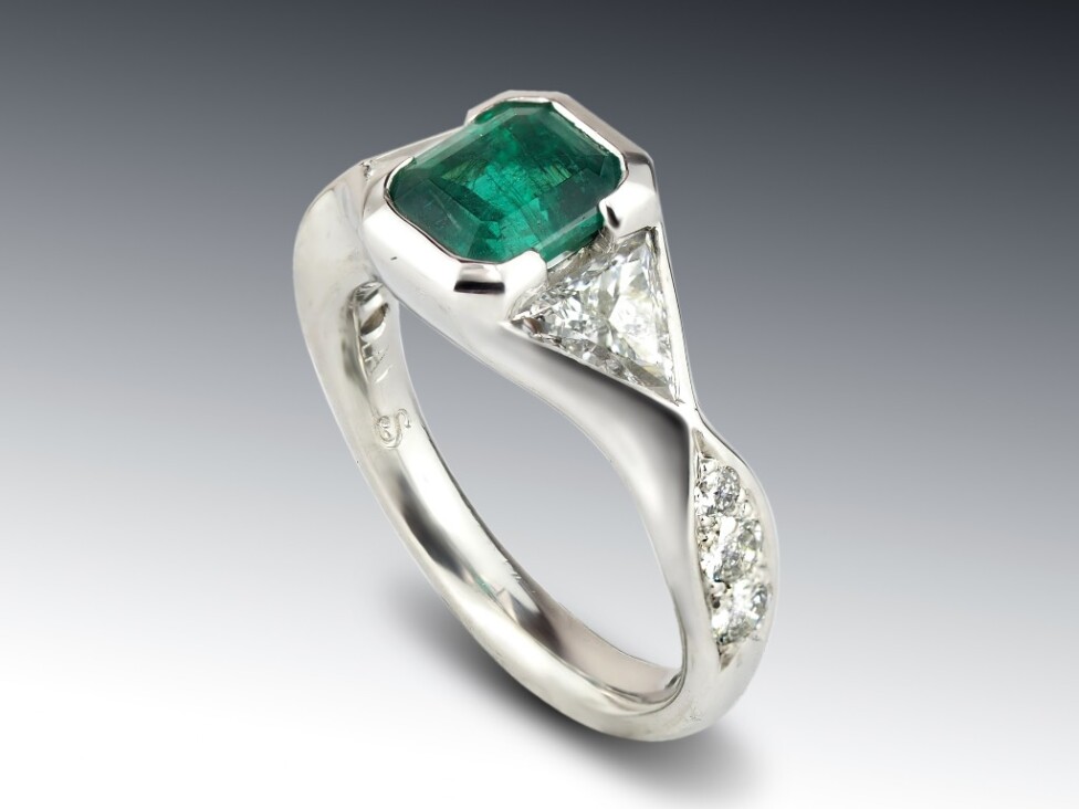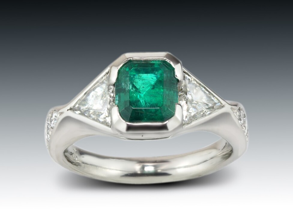 This platinum emerald and diamond trillion ring was custom designed and made by hand at our shop in Boston. Browse our Lookbook for more design inspiration, and contact us today to get started on your custom designed jewelry project.