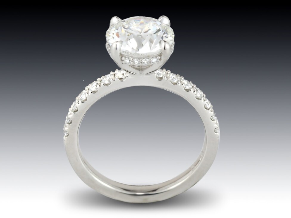 This designer platinum four prong engagement ring was custom made at our shop in Boston. This ring features a round brilliant center diamond in a four prong diamond lined basket setting. The squared shank is also lined with small prong set diamonds.