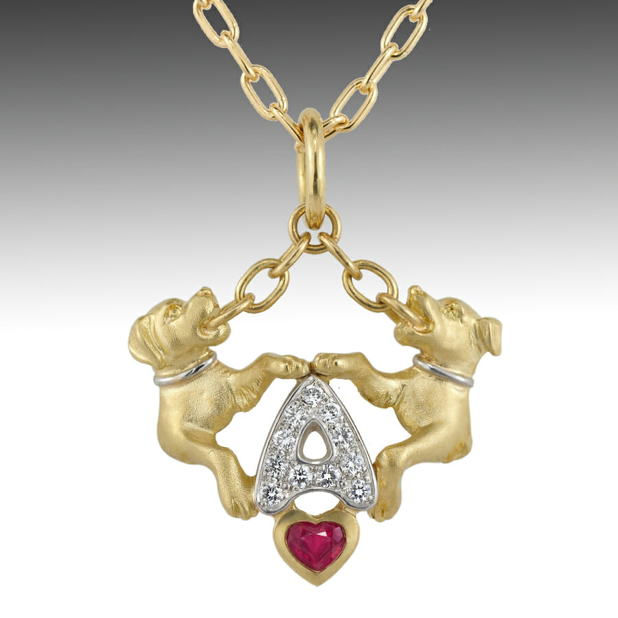 This puppy love pendant was a custom commission. It is crafted in 18k yellow gold with diamonds and a heart shaped ruby.