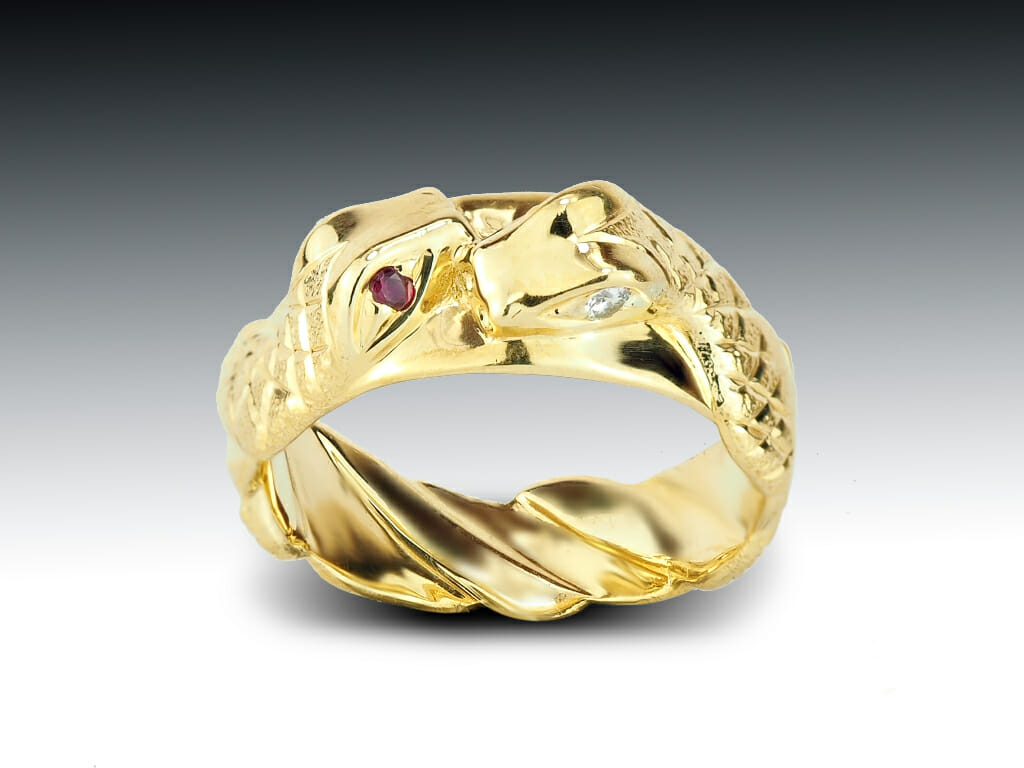This ruby diamond eye snakes ring is a custom designed and handcrafted piece. This ring was carved by hand and cast in solid gold with diamonds and rubies set in the snakes eyes.