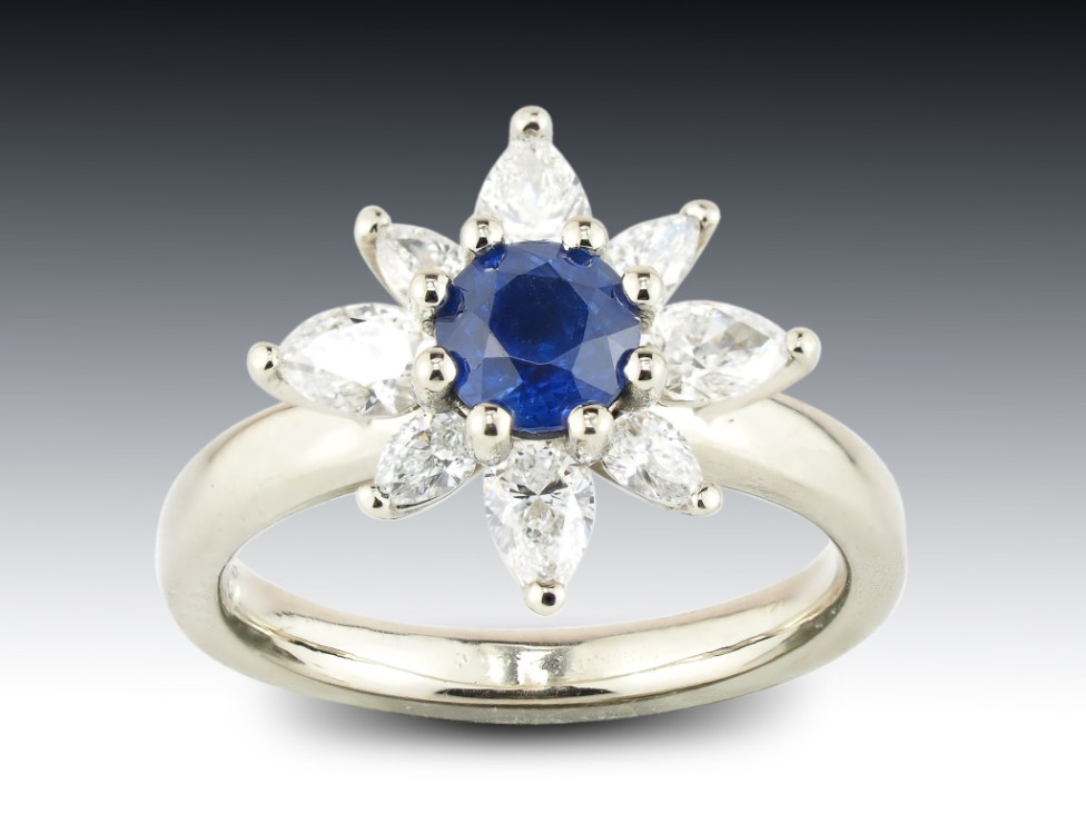 This sapphire and diamond flower ring was a custom made piece. We started with the idea of a flower ring and elevated it with a deep sapphire and pear shaped diamond petals for an elegant and timeless heirloom quality piece.