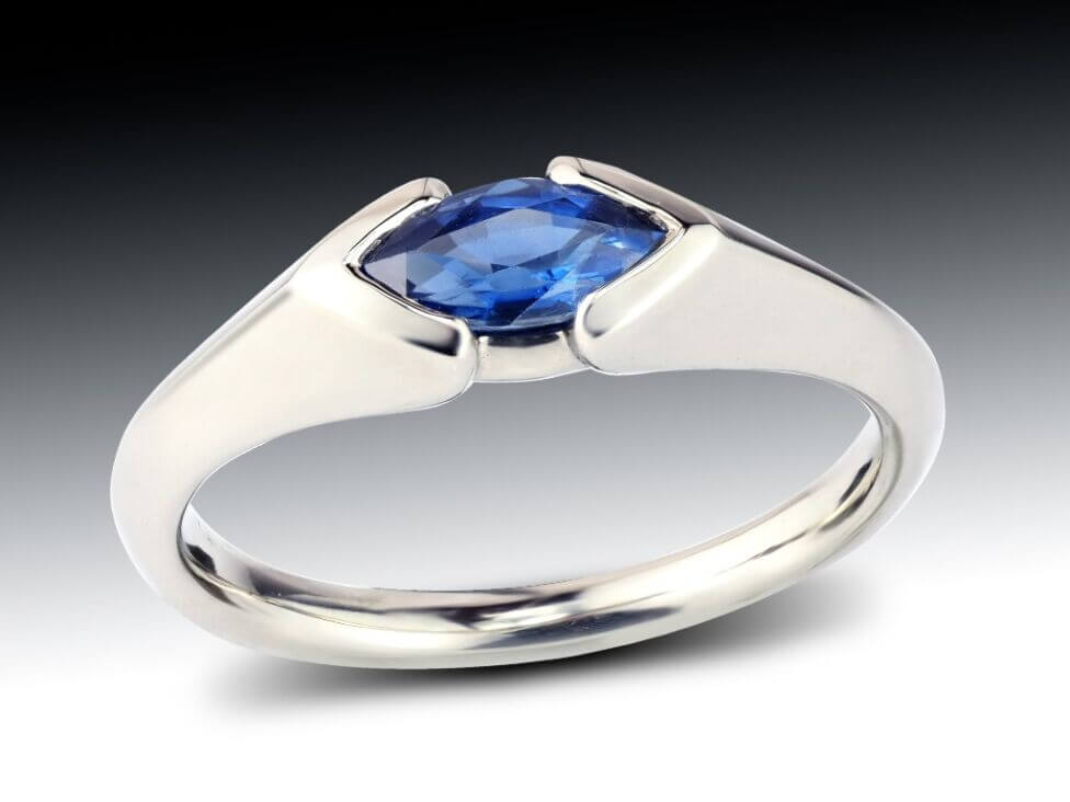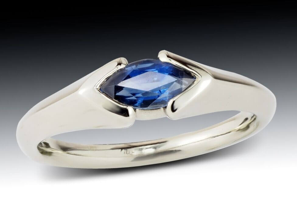 This custom-ordered sapphire marquise modern ring from Skylight Jewelers features a striking marquise-cut blue sapphire set in a sleek, high-polish band. The clean lines and sculpted setting cradle the sapphire securely while allowing its vivid color and faceting to take center stage. Understated yet distinctive, this design balances modern minimalism with timeless elegance.