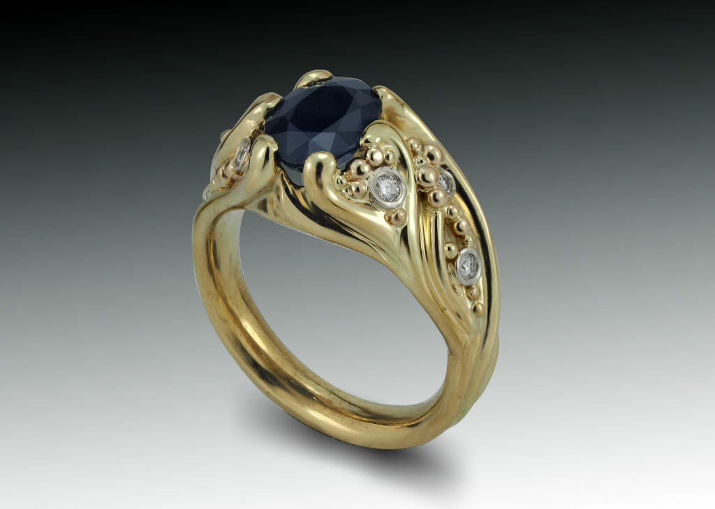 Dark blue sapphire clasped in tendrils of 18k gold and scattered granulation. Custom designed by Skylight Jewelers.