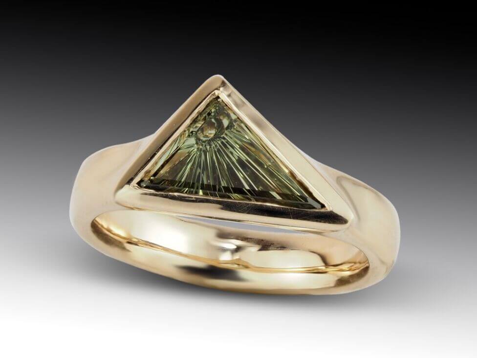 This archived custom ring features a striking parti sapphire cut in a dramatic sun-ray fan pattern, set in rich yellow gold. The angular bezel and sculptural band frame the gemstone’s natural blend of green and golden hues, creating a bold yet refined design. Clean lines and thoughtful proportions highlight the artistry of the custom cut and setting. A distinctive, one-of-a-kind piece from our archive, this ring is no longer available for purchase. Contact us to schedule your custom design consultation.