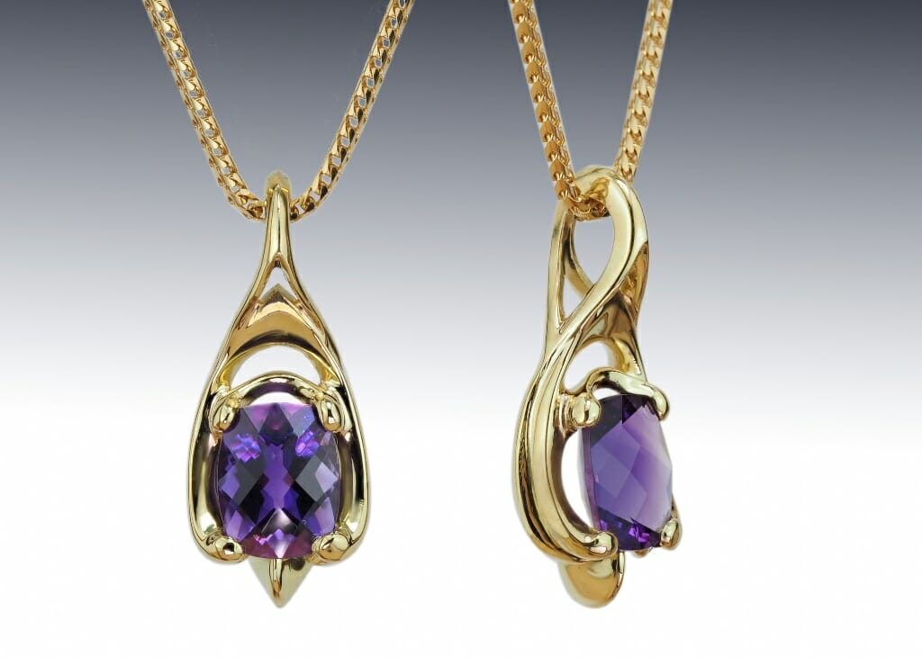 A custom designed 18k gold pendant for faceted vivid purple amethyst, handmade at our shop in Boston.