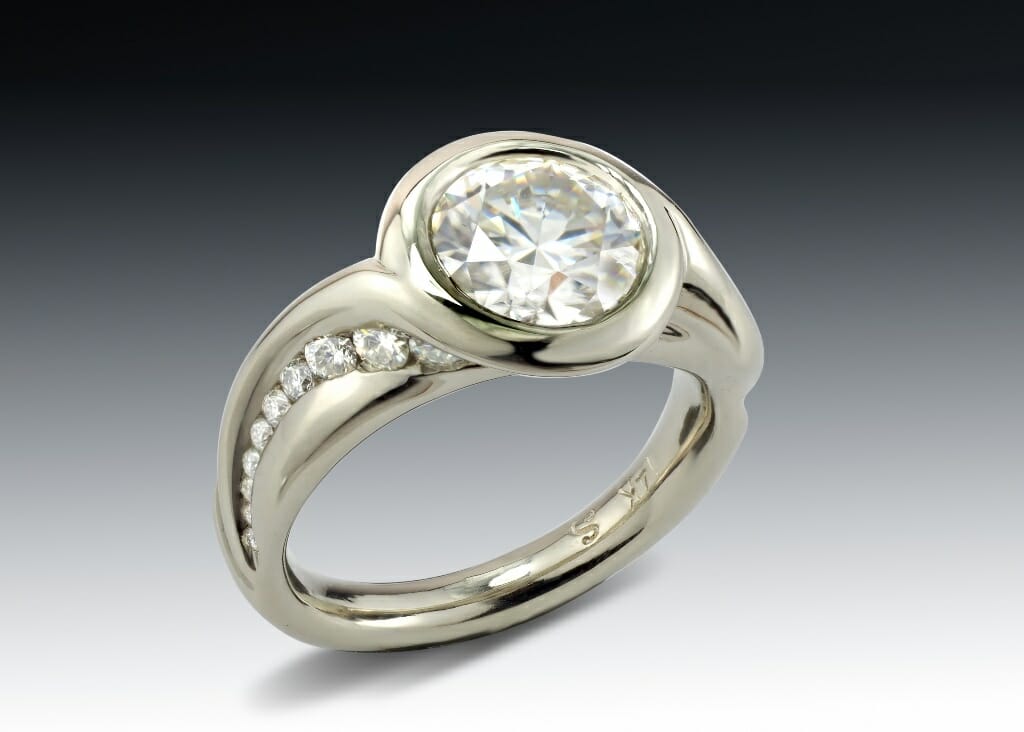 Custom designed diamond engagement ring in 14k white gold. The center stone is set in a full bezel with a swirled, carved shank set with a channel of diamonds.