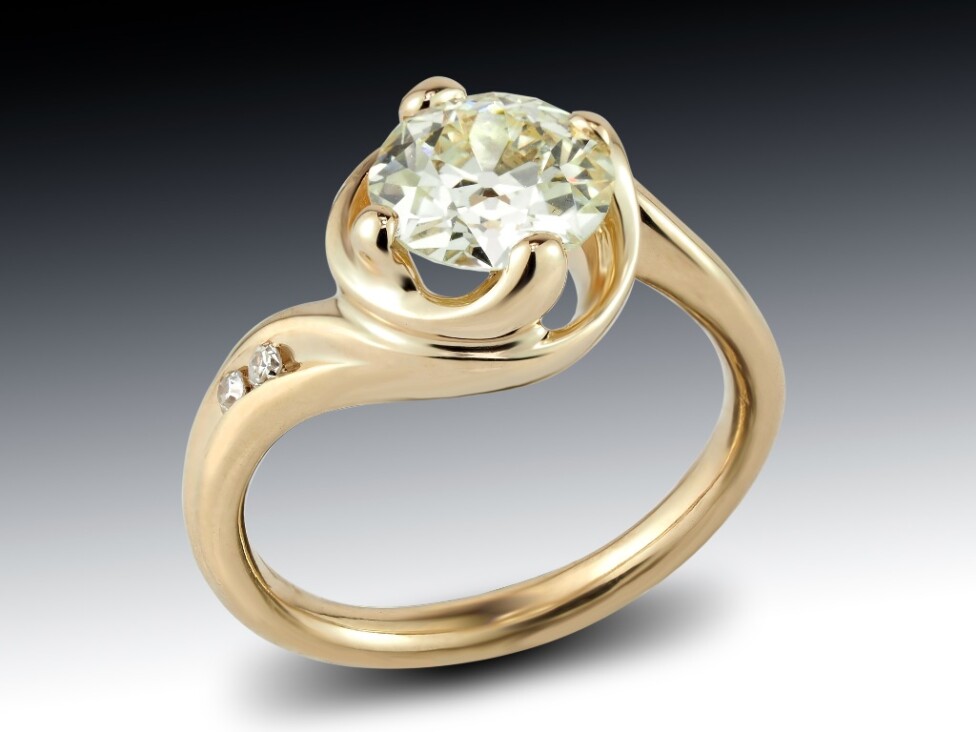 This swirled gold diamond ring was custom designed at our studio in Boston. This bespoke engagement ring was made of solid 14k yellow gold and set with a center round brilliant diamond and small diamond accents. Contact us to get started on your custom engagement ring.