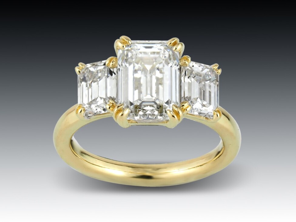This triple emerald cut diamond engagement ring was a custom designed and handcrafted creation from our shop in Boston. This ring features three emerald cut diamonds set in double prongs in a hand sculpted 18k yellow gold setting. More about custom design…