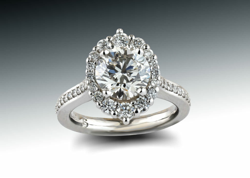 Vintage style diamond halo engagement ring.  Custom designed and hand crafted at Skylight Jewelers.