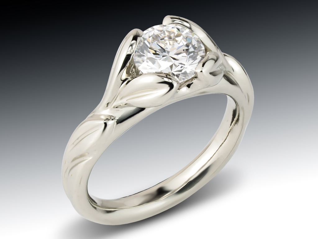This white gold leaf design engagement ring was custom designed and crafted at our studio in Boston. This ring setting was hand carved and cast in solid white gold and set with a single round diamond. Contact us to schedule a design consultation.