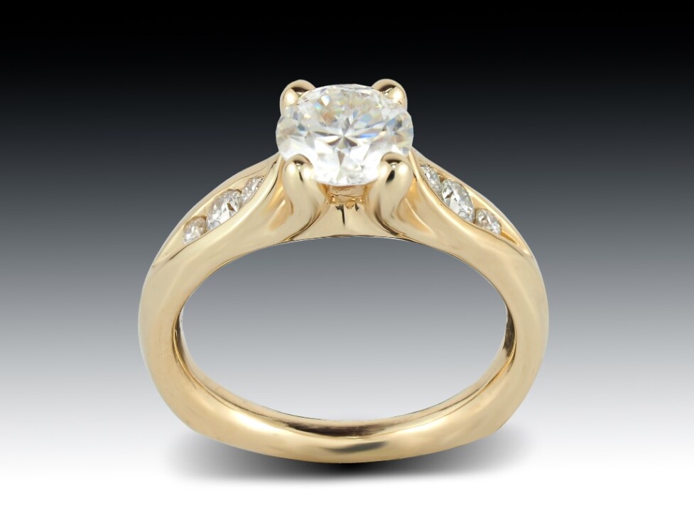 This yellow gold diamond four prong ring was custom designed at our studio in Boston. The handcrafted 18k yellow gold setting was made to highlight the center round diamond, with side diamond accents.