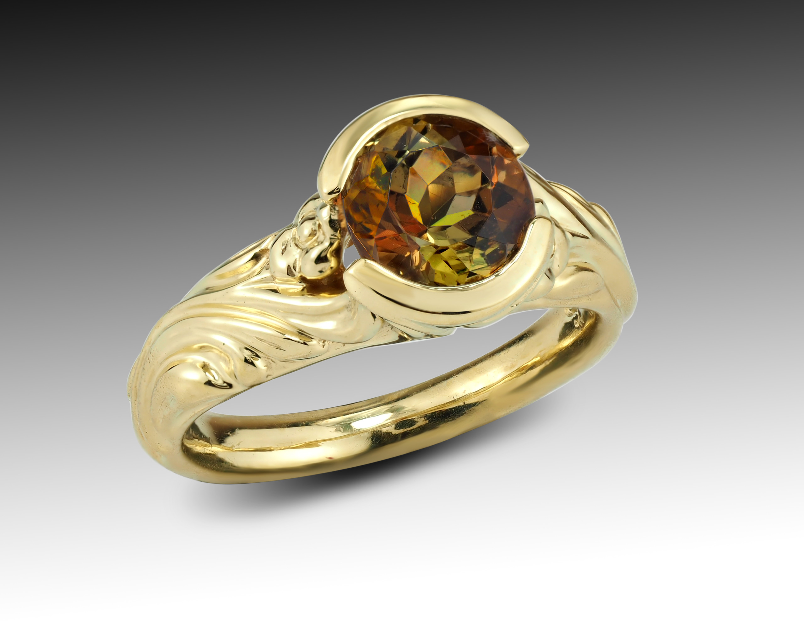 Our andalusite floral ring is a handcrafted custom piece from our studio in Boston. This ring is hand carved with a floral design and cast in rich 18k yellow gold. The faceted andalusite gemstone is set in a partial bezel. Contact us with questions about ring sizing.