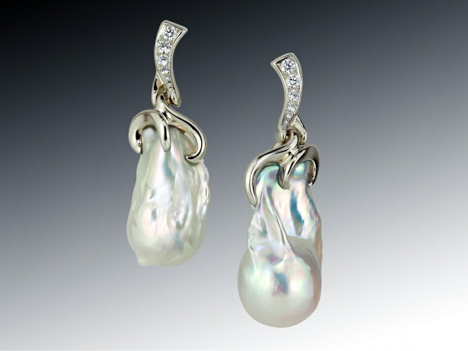 Our baroque white pearl dangle earrings are custom designed and handcrafted, from our shop in Boston. These hand carved white gold earrings showcase natural baroque white freshwater pearl drops dangling from a hinged, diamond encrusted top. These earrings have omega back closures.