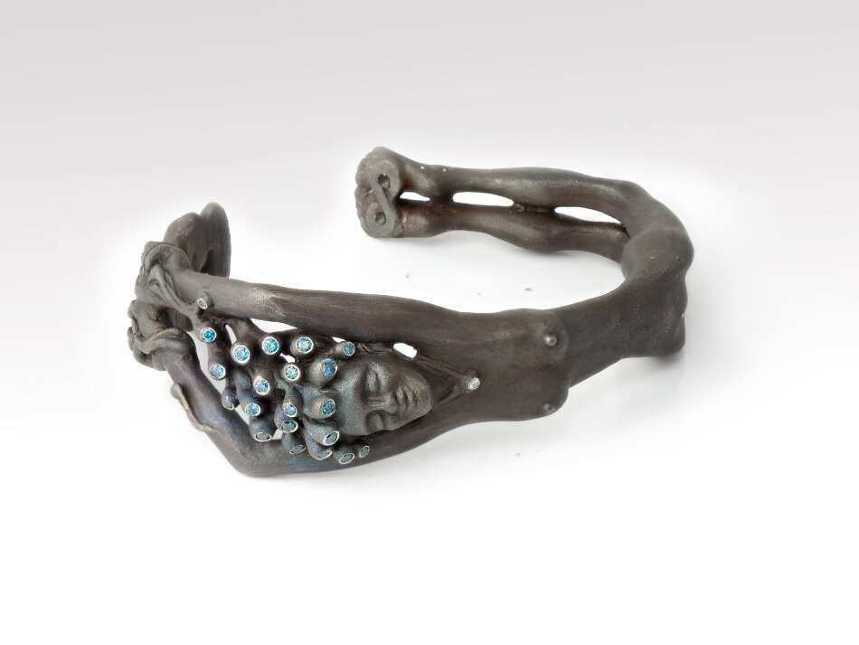 We took our acrobat design to the next level with this blue diamond steel acrobat bracelet. This hand carved figure is cast in stainless steel and finished with blue diamonds and one white diamond in her hair.