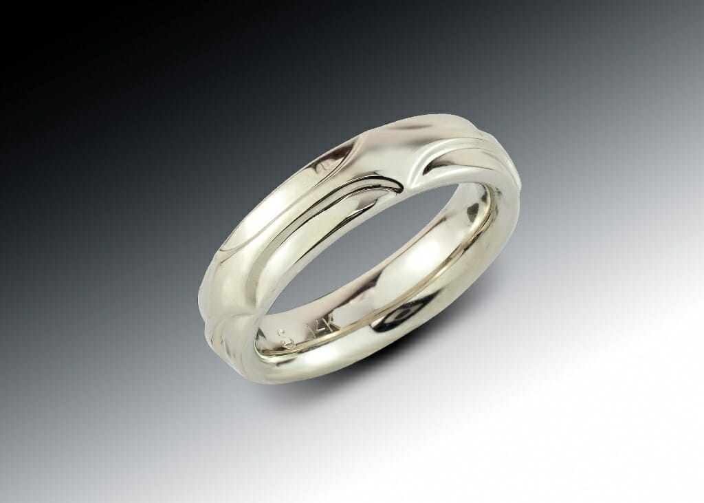 This convex rhombus carved band is custom designed and hand crafted at our studio in Boston. This ring is first carved in wax and then cast in white gold. The final finishing details are completed in our workshop above our showroom. Contact us for help with ring sizing and questions.
