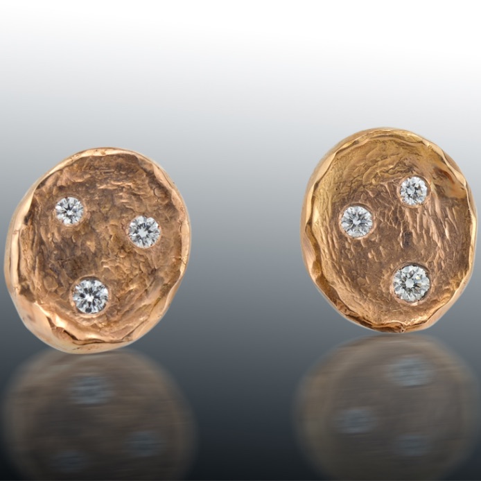 Our diamond rose gold textured earrings are custom designed and handcrafted at our studio in Boston. These earrings are made in rose gold and textured by hand, then set with diamonds. We love the contrast of the rough texture metal with the sparkling, faceted diamonds.