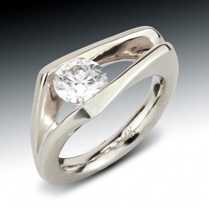 Our floating 14k white solitaire ring is custom designed and hand crafted at our studio in Boston. The ring is cast in 14k white gold and set with a solitaire gemstone in our floating style setting.