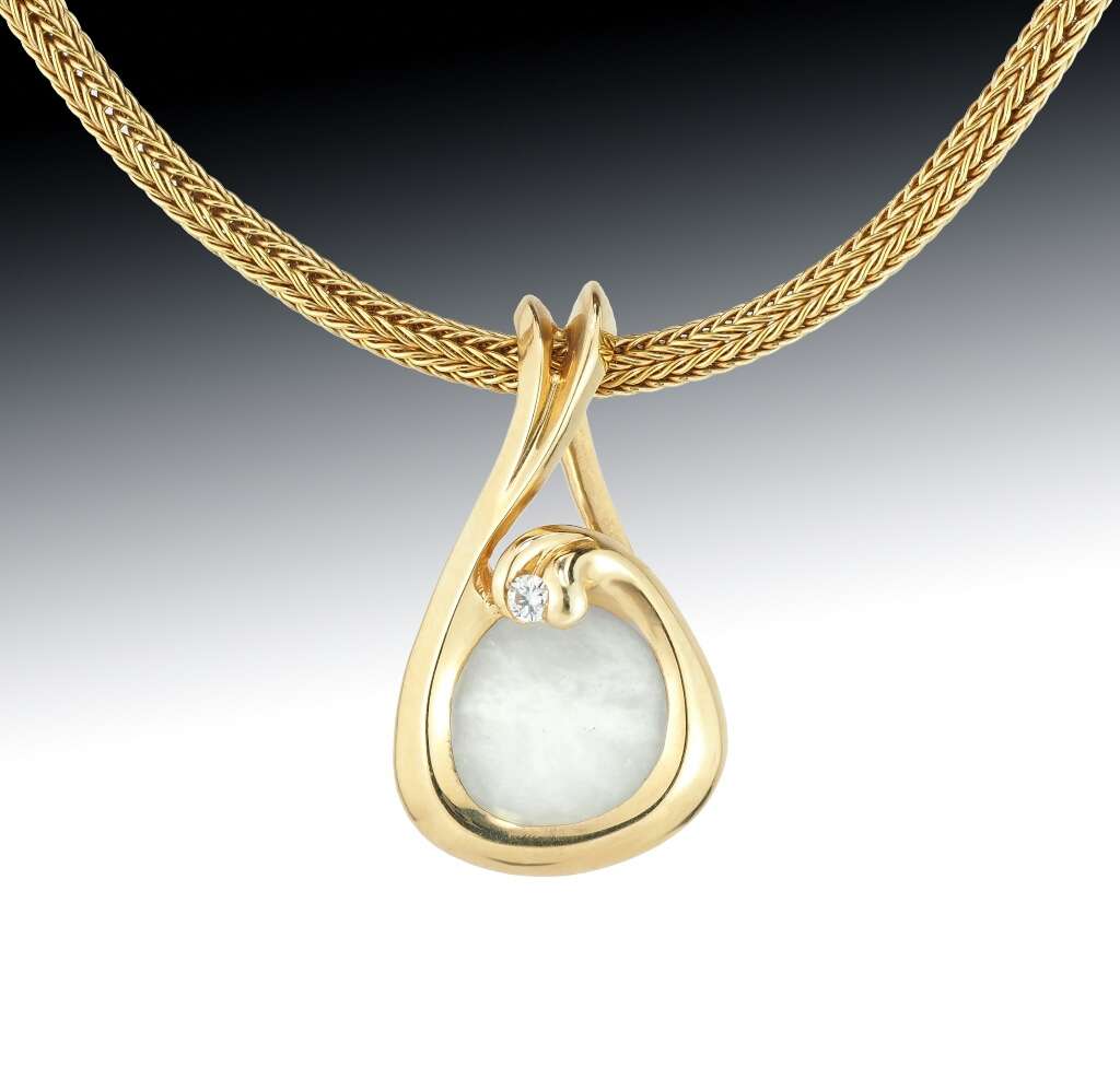 Our gold beach pebble pendant is custom designed and handcrafted at our studio in Boston. The stone in this pendant is a beach pebble found on Long Island. The pendant setting is hand carved, cast in solid 14k yellow gold, and set with a diamond. The large bail can accommodate a variety of chains and cords, sold separately.
