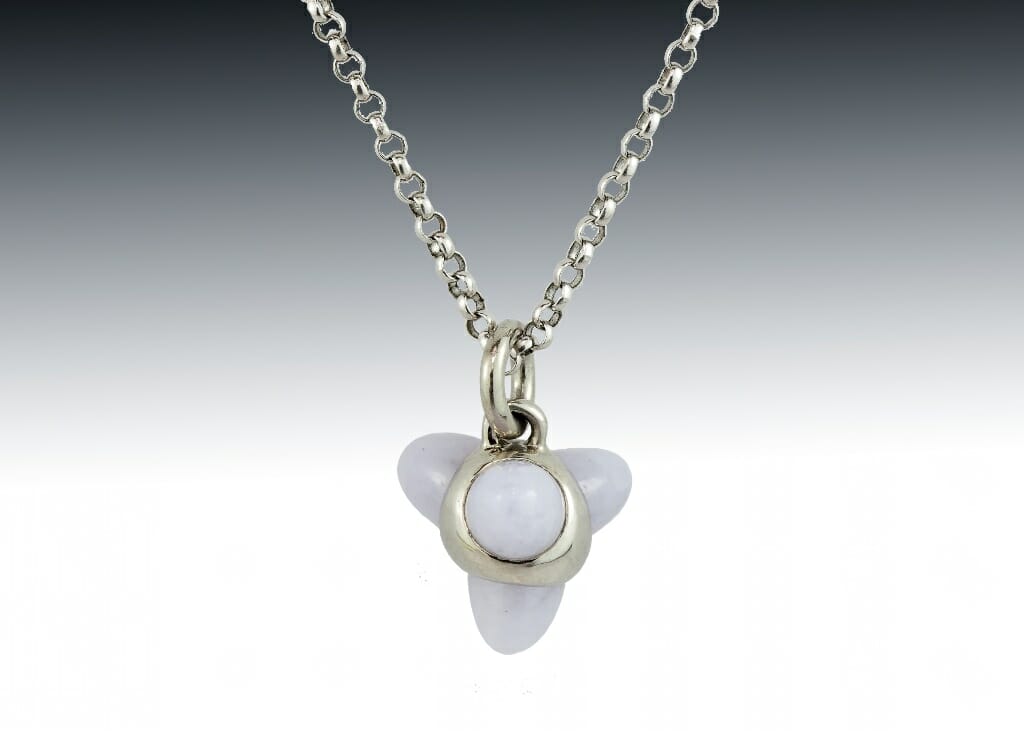 This jadeite tetrahedron pendant is a custom piece from our studio in Boston. Spencer hand crafts his tetrahedron pendants in wax before they are cast in metal. This pendant is made of palladium and set with pale purple lavender jadeite. It is suspended from a hand crafted thick circular ring of palladium and can be worn on a variety of chains and cords, sold separately.