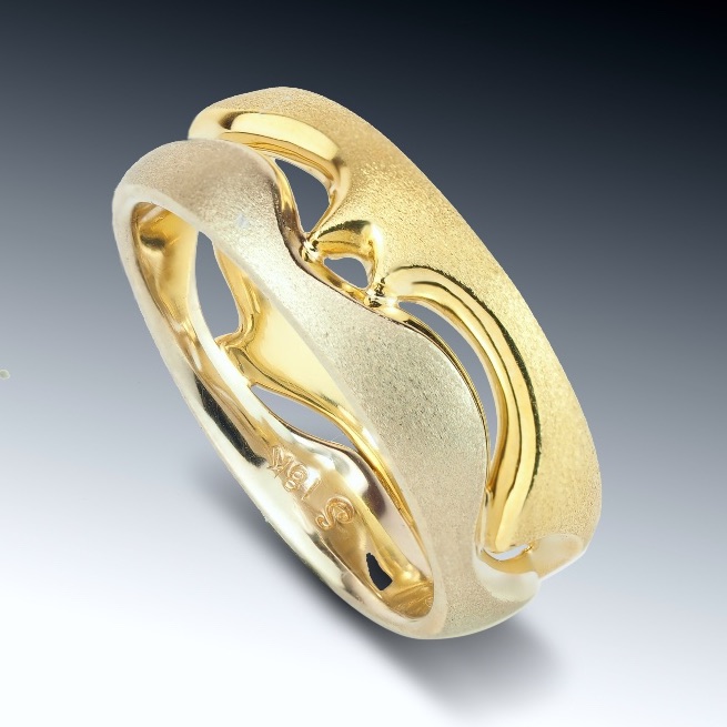 Our mens two tone wave band is custom designed and hand crafted at our studio in Boston. The carved wave design with cutouts is made of 18k white gold and 18k yellow gold. Contact us for sizing info, or to order a custom size ring.