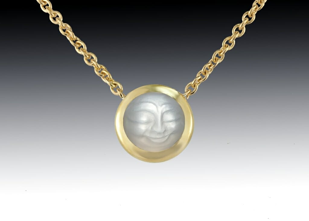 This moonstone yellow gold bezel necklace is from our signature carved moonstone collection, designed and crafted by hand at our studio in Boston. Spencer carves each moonstone ‘face’ by hand in the finest quality moonstone from Sri Lanka. Each setting is custom made in precious metal and finished by hand at our studio in Boston. Learn more about our carved moonstone jewelry