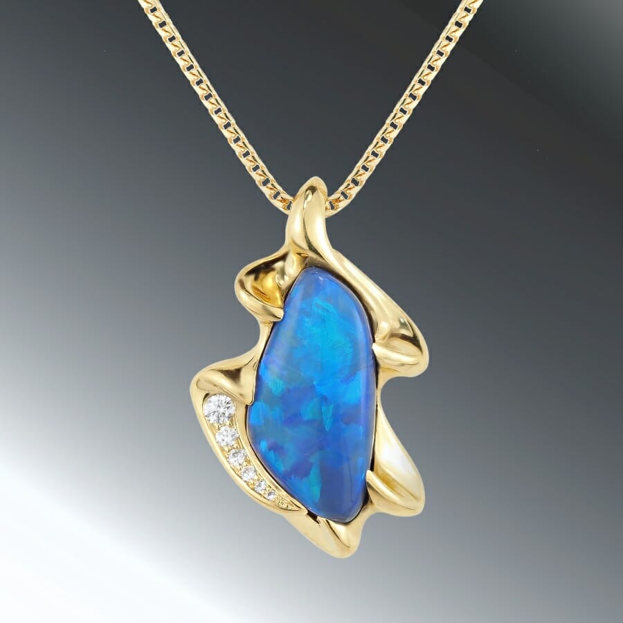 This opal zigzag pendant is a custom designed and handcrafted piece from our studio in Boston. This stunning pendant is sculpted in rich yellow gold and features an intense dark blue opal and diamond accents. This pendant can fit on a variety of chains and cords, sold separately.